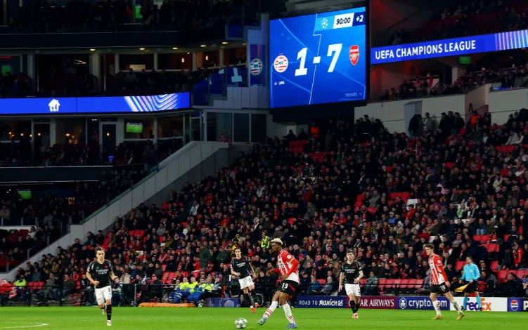 وبفضل هدفين من مارتين أوديغارد وهدف لكل من: جورين تيمبر، وإيثان نوانيري، وميكيل ميرينو، ولياندور تروسارد، وريكاردو كالافيوري، فاز أرسنال على آيندهوفن 7 / 1، محققا أكبر نتيجة لفريق يلعب خارج أرضه في دوري أبطال أوروبا، وكانت هذه المباراة بمثابة لحظة تحول مذهلة في حظوظ فريق أرتيتا، الذي كان يعاني من قلة الأهداف في السابق.