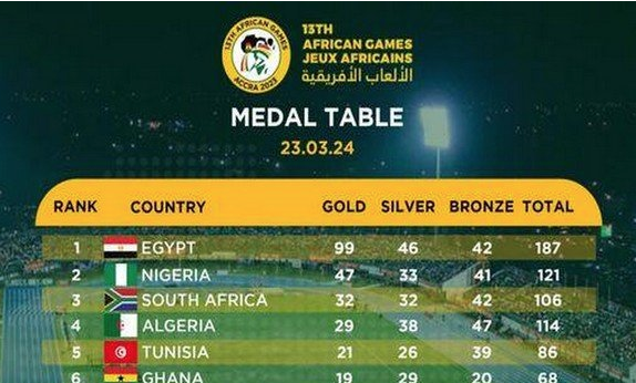 و تصدرت مصر ترتيب مجموع الميداليات النهائي ب191 ميدالية (102 ذهبية,47 فضية و42 برونزية), متبوعة بنيجيريا ب121 ميدالية (47 ذهبية, 34 فضية و40 برونزية) وجنوب افريقيا ب106 ميدالية ( 32 ذهبية, 32 فضية و42 برونزية).
