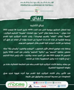وقال الاتحاد الجزائري في بيان عبر موقعه الرسمي: “يكذب الاتحاد الجزائري، وبصفة قطعية، كل هذه الادعاءات العارية من الصحة، مؤكدا أنه لم يتلقى أية مراسلة من الفيفا، بشأن هذا الموضوع المزعوم”.