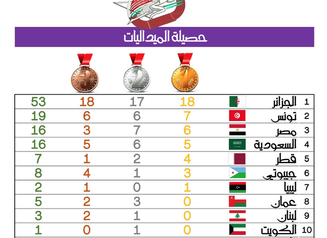 1 – الجزائر بمجموع 53 ميدالية ( 18 ذهبية و17 فضية و18 برونزية)