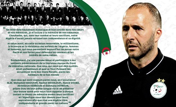 وجه الناخب الوطني جمال بلماضي رسالة تقدير و اجلال لشهداء الثورة الجزائرية المجيدة, ابرز فيها شجاعة و بسالة ابناء الجزائر, من الرجال و النساء الذين ضحوا بالنفس و النفيس من أجل تمكينينا من العيش في كنف الكرامة, و هي التضحية التي “نستمد منها اليوم عزتنا و قوتنا في الدفاع عن الالوان الوطنية و المصلحة العليا للوطن”.