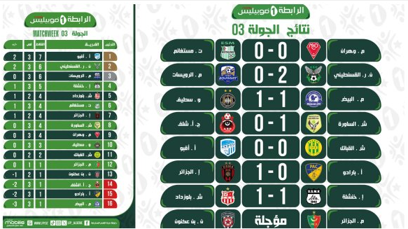 النتائج الجزئية والترتيب لمباريات الجولة الثالثة لبطولة الرابطة الأولى “موبيليس” لكرة القدم, التي جرت يومي الجمعة والسبت :