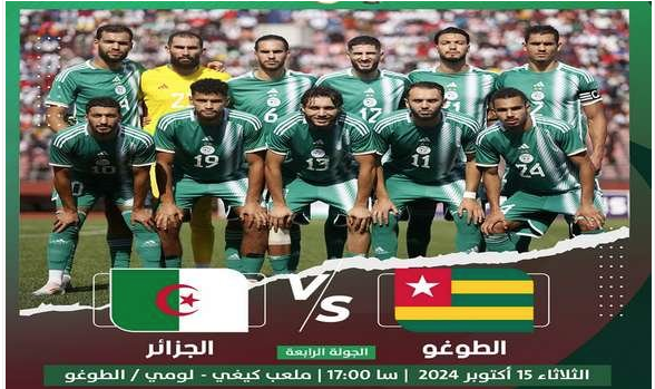 يواجه المنتخب الجزائري نظيره الطوغولي يوم الثلاثاء 15 اكتوبر بملعب كيغي بالعاصمة لومي على الساعة 00ر17 (بالتوقيت الجزائري), لحساب الجولة الرابعة (المجموعة 5) من التصفيات المؤهلة لنهائيات كأس إفريقيا للأمم 2025, حسبما اعلنته الاتحادية الجزائرية لكرة القدم مساء اليوم الثلاثاء.