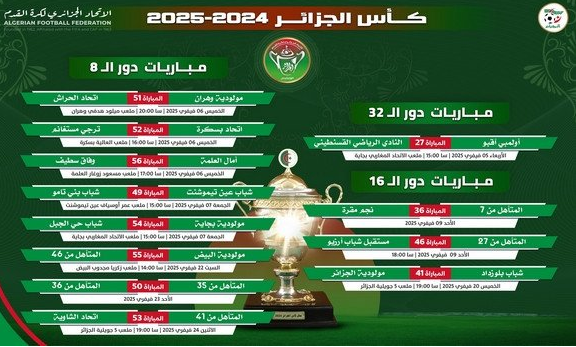 وتنطلق مواجهات الدور ثمن النهائي يوم 6 فبراير 2025 بإجراء المباراة الواعدة بين مولودية وهران واتحاد الحراش بملعب -ميلود هدفي- بوهران.